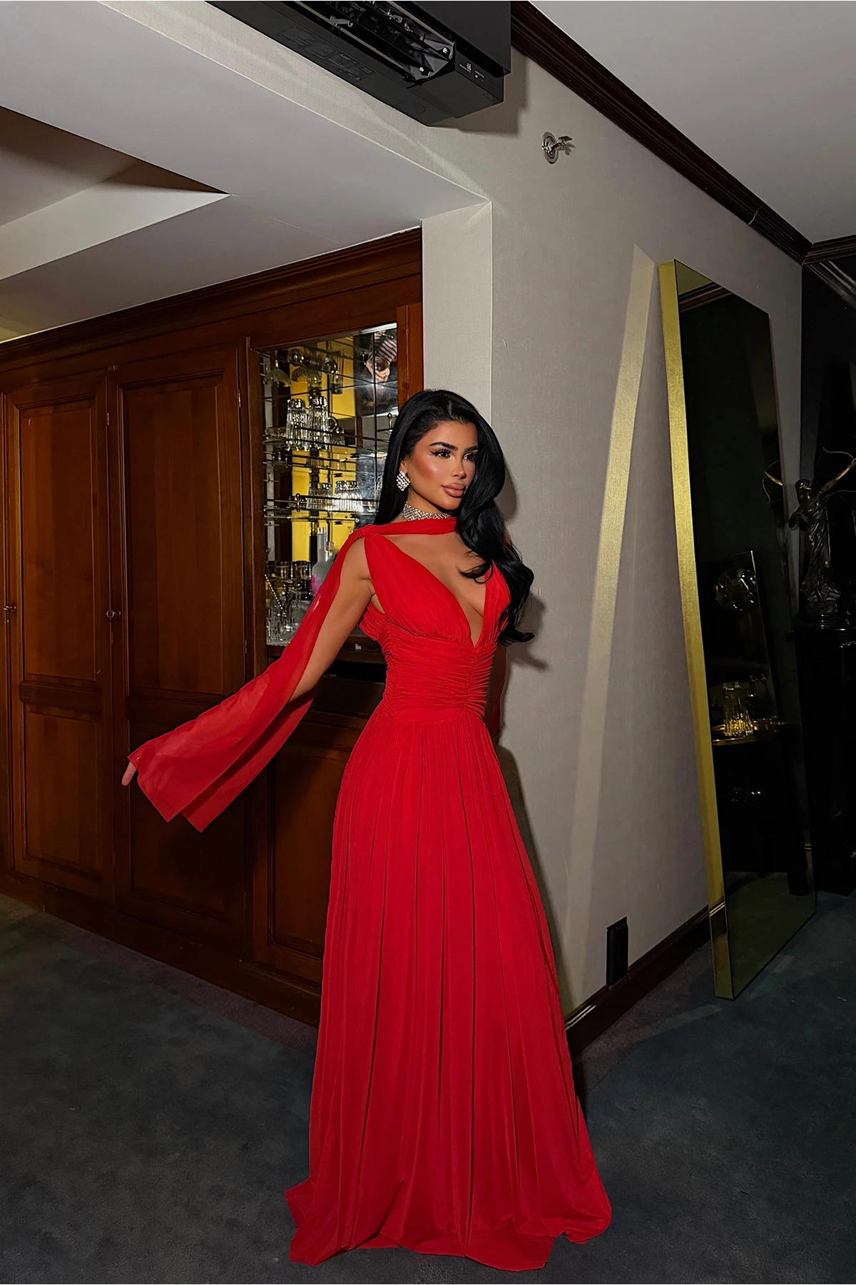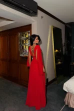 Fustan i kuq i mbledhur me detaje
